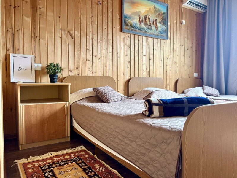 | Номер Номер 2-местный Сардиния | 13 кв.м. | 2 чел. | Мебель (зеркало, кровать двуспальная, кровать односпальная), Оборудование (вентилятор), Санузел (с д... | |